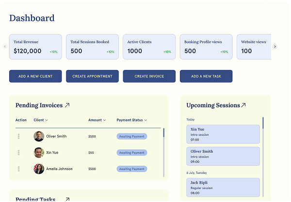 Track sessions, income, occupancy, and trends — all from one clean dashboard.