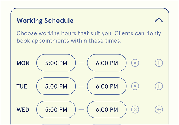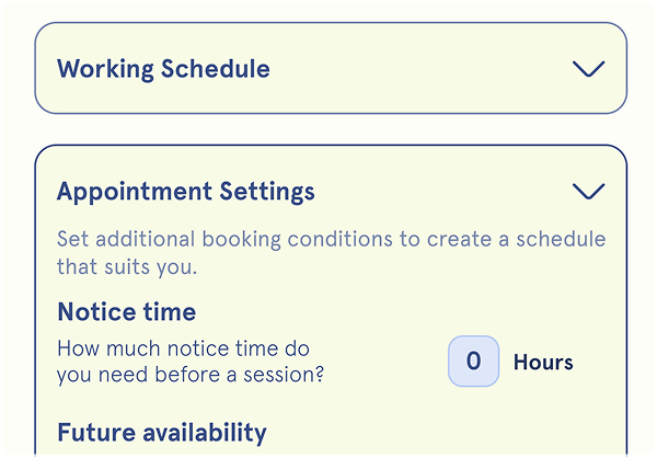 Set your preferred working days, hours, and session types so your calendar reflects your exact availability.