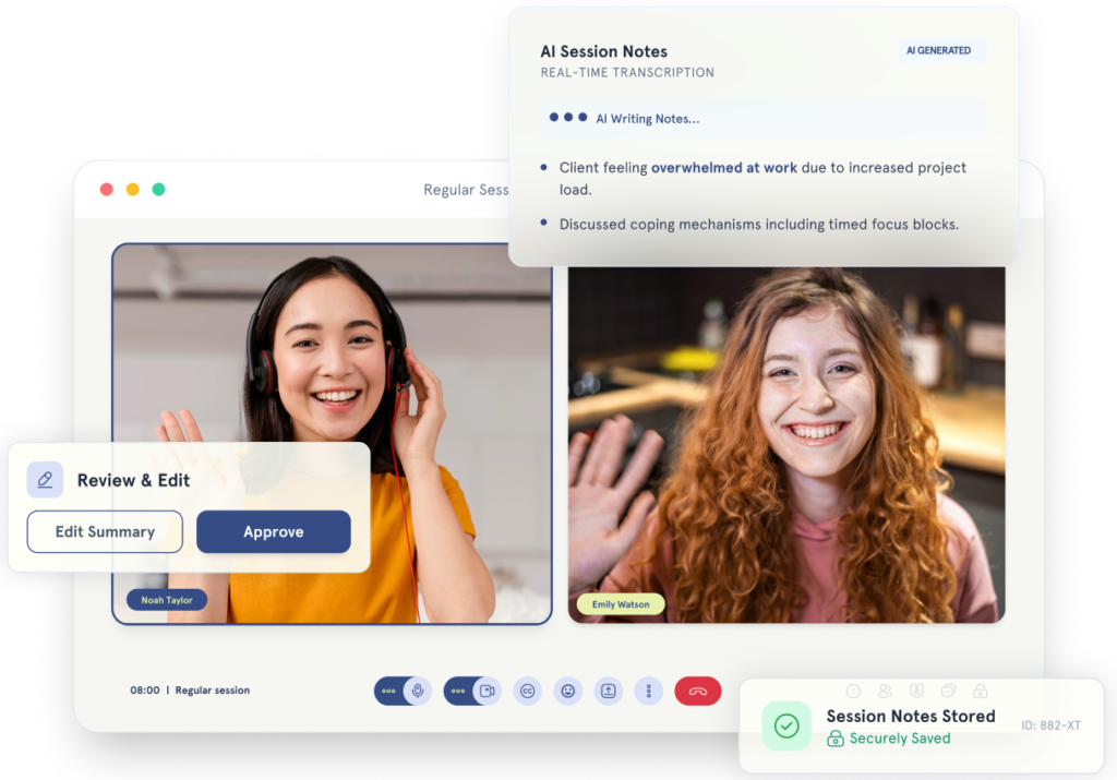 Our integrated AI automatically takes notes during sessions, helping you capture key insights and save hours of admin time. Review, edit, and store everything securely in one place.